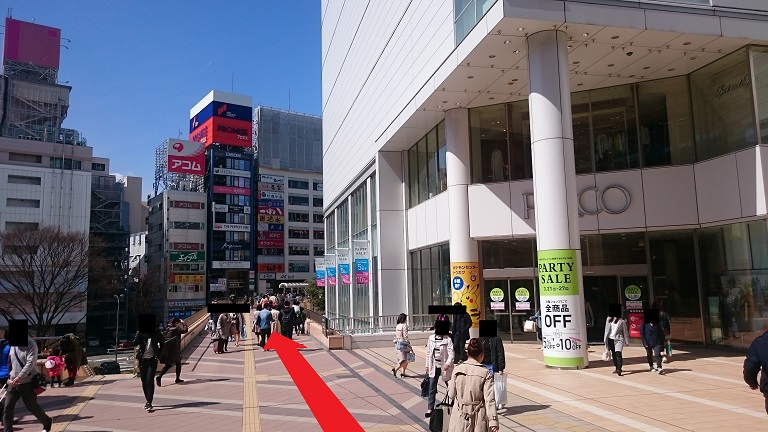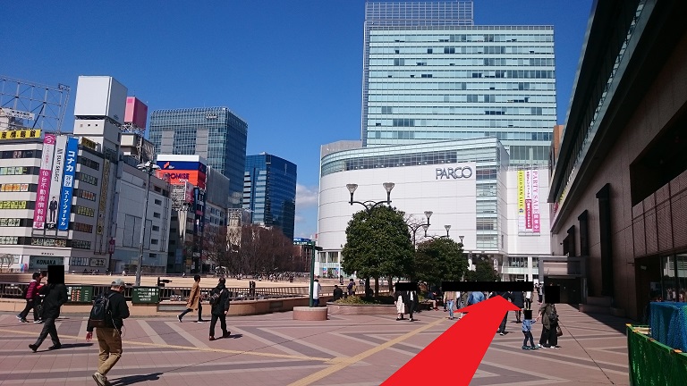 ③ステンドグラス付近の出口から右手側にある、PARCOのビルに向かって歩きます。