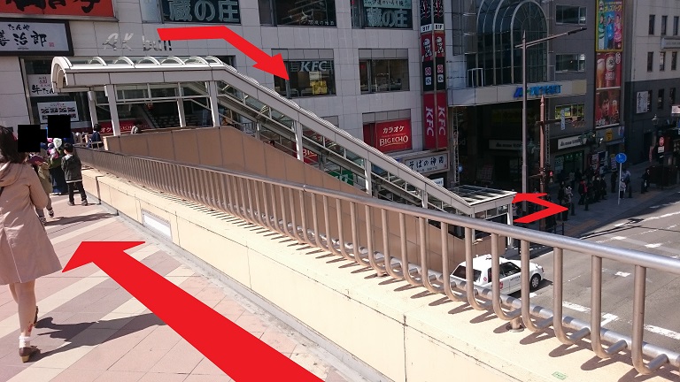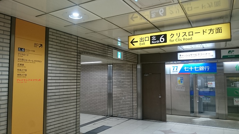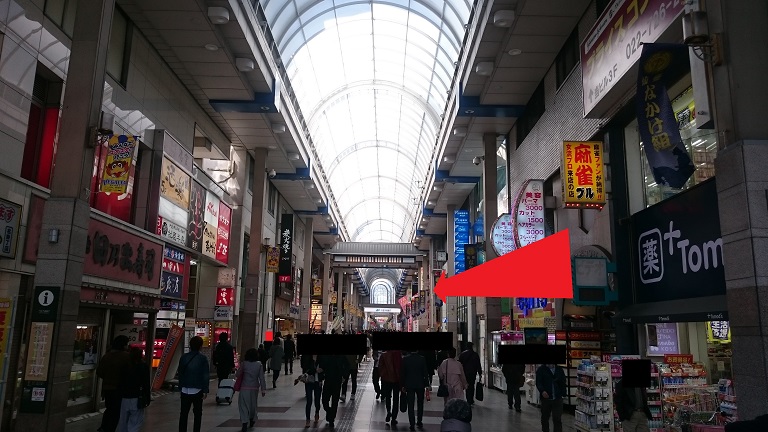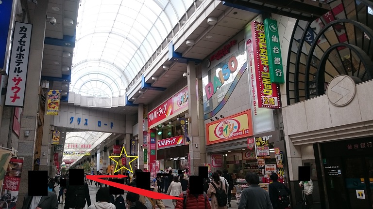 北6出口(クリスロード方面)から上がり、左手側にあるアーケードに入ります。