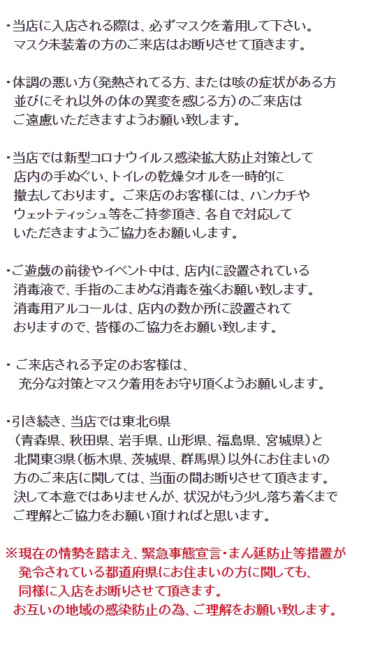 コロナウイルス感染防止に向け、ご協力をお願い致します。