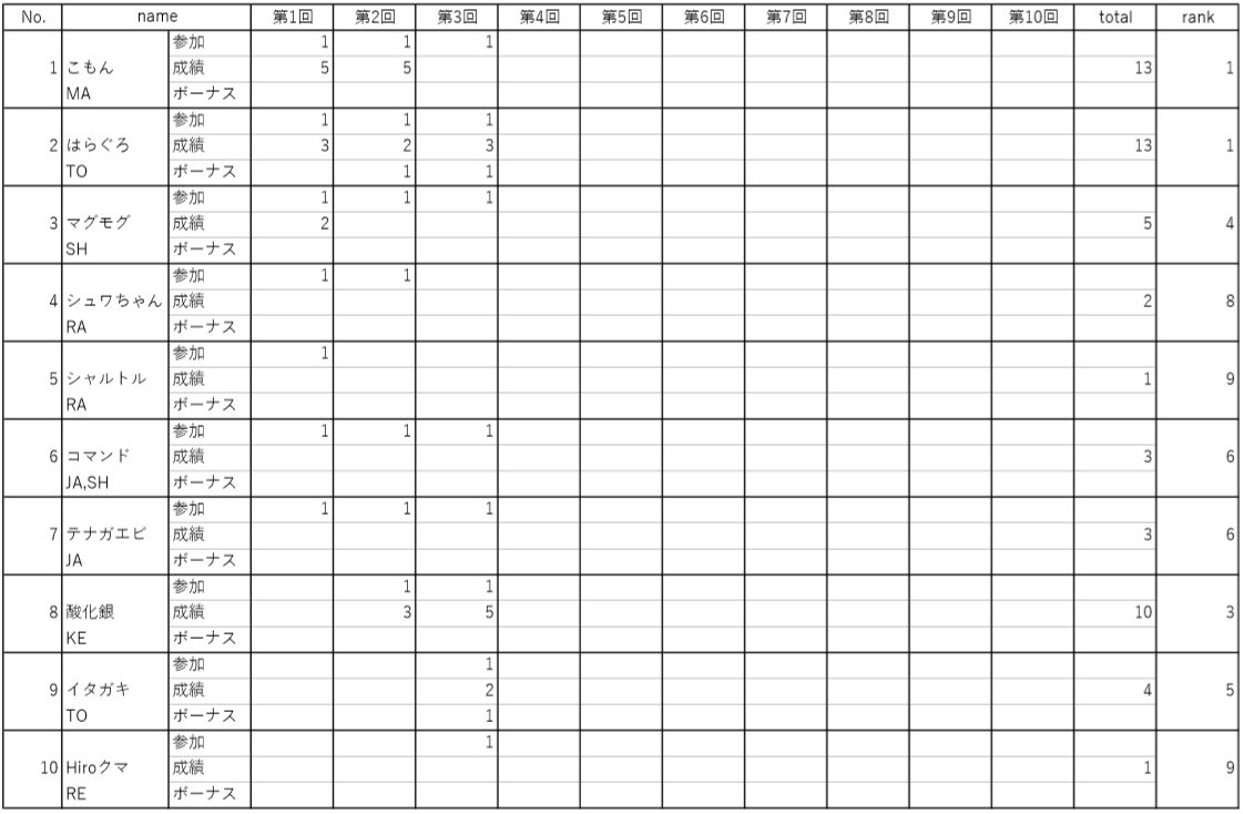 第1回・2回の大会結果の結果は以下の通りです。